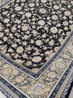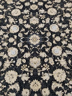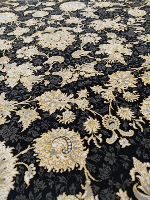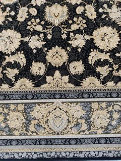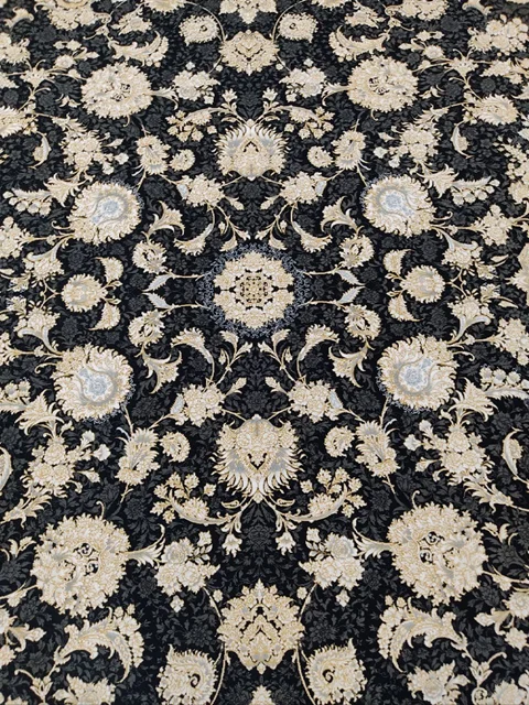 فرش عظیم زاده نقشه دنیز زمینه سرمه ای طلاکوب یکی از شاهکارهای اصیل ایرانی است که با طراحی فاخر و رنگبندی چشم نواز، جلوه ای سلطنتی به دکوراسیون میبخشد.