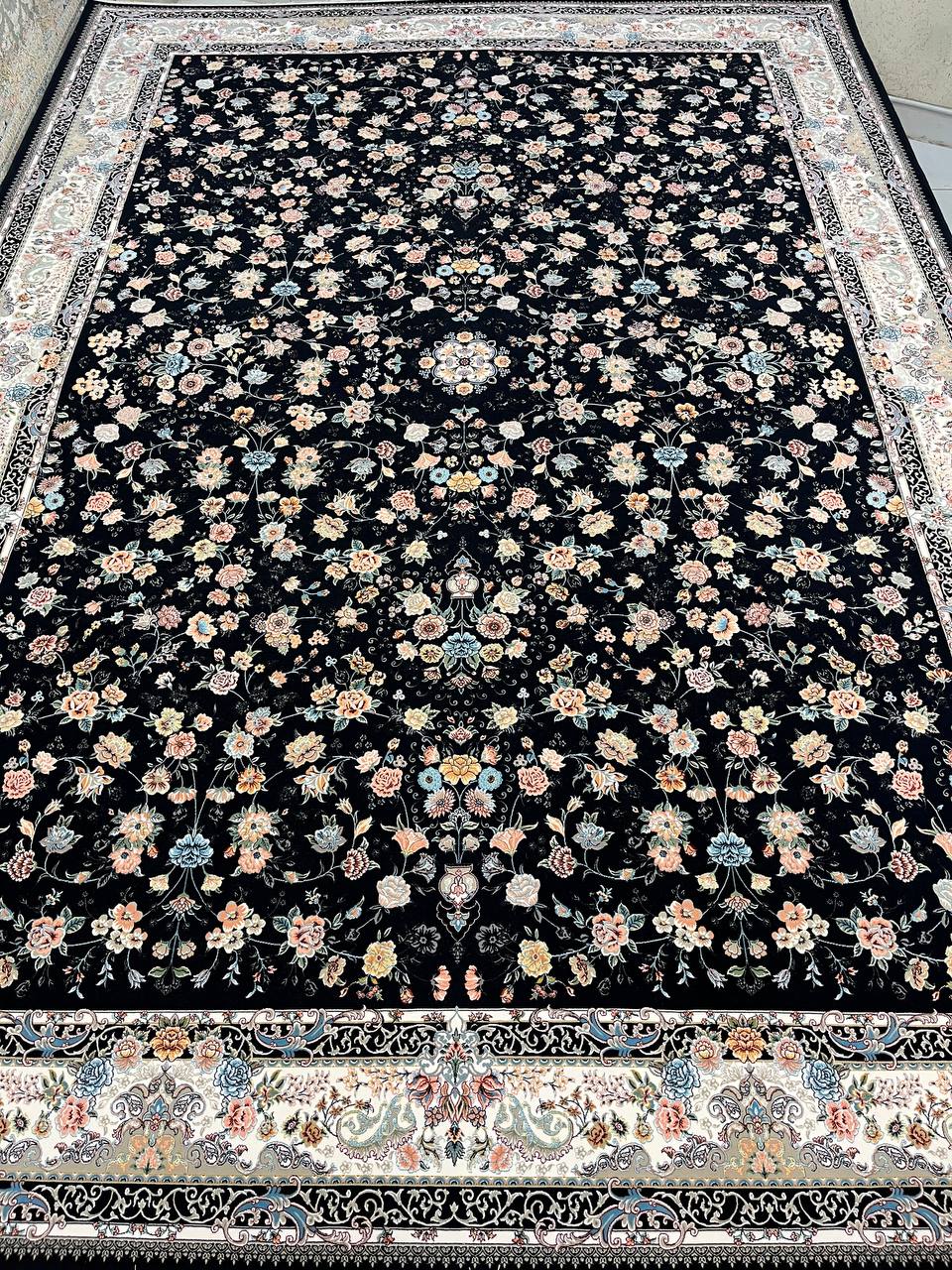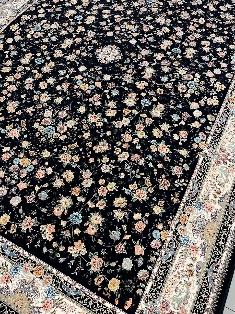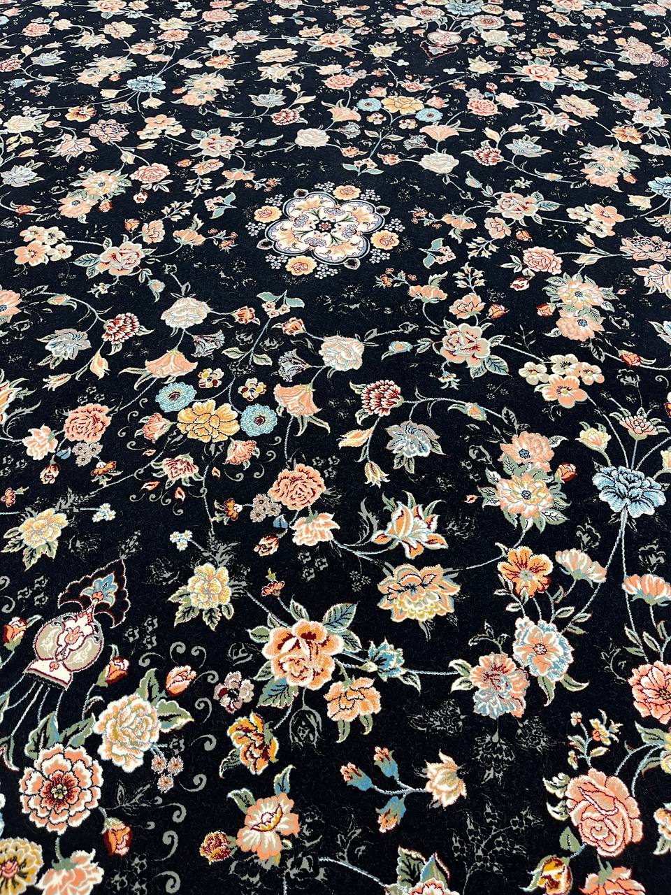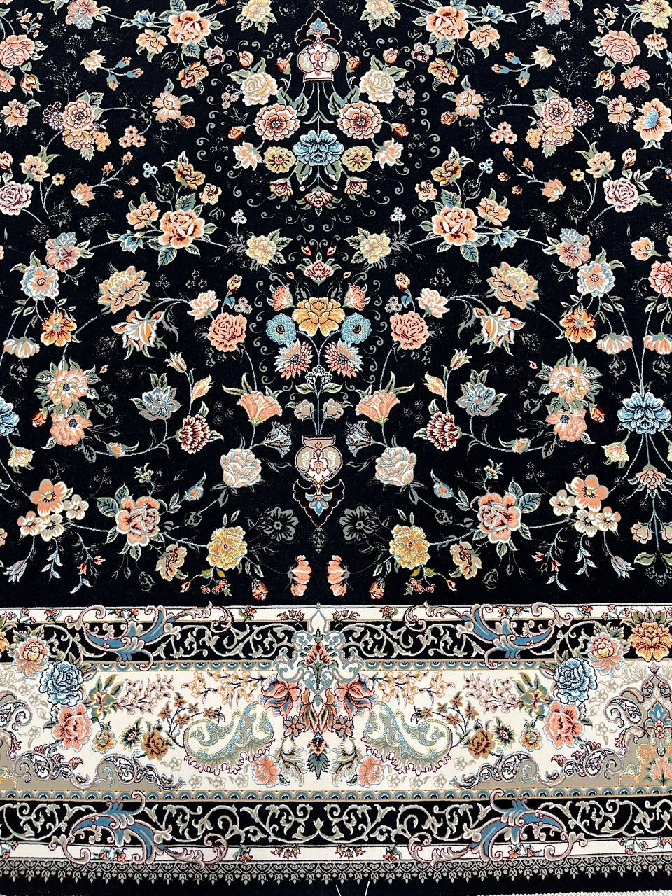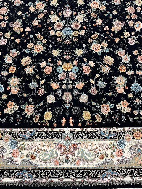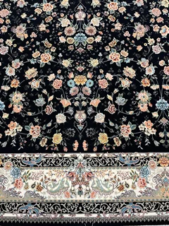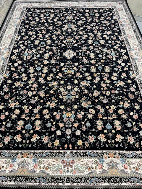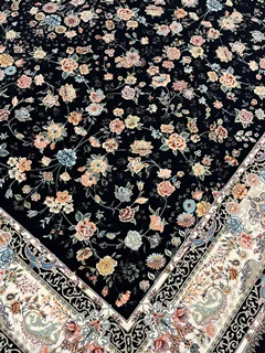 فرش عظیم زاده نقشه سعادت زمینه سرمه ای یکی از شاهکارهای اصیل ایرانی است که با طراحی فاخر و رنگبندی چشم نواز، جلوه ای سلطنتی به دکوراسیون میبخشد.