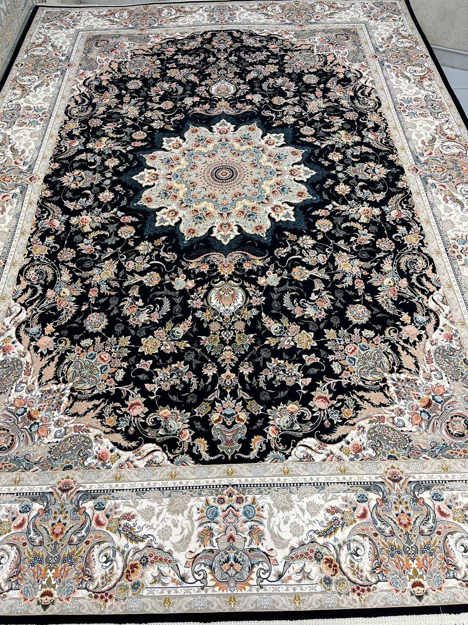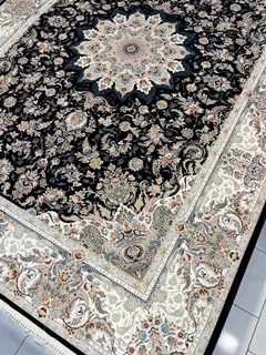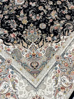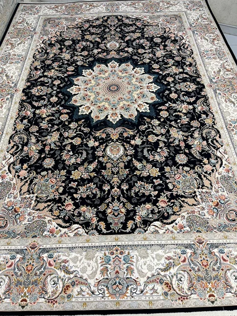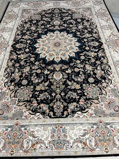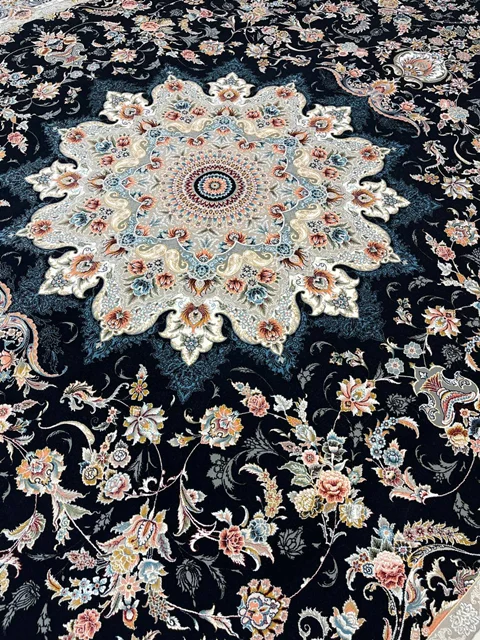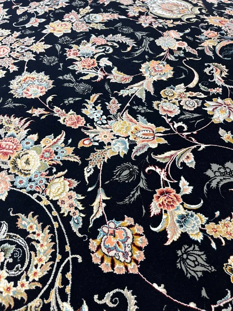فرش عظیم زاده نقشه برمودا زمینه سرمه ای یکی از شاهکارهای اصیل ایرانی است که با طراحی فاخر و رنگبندی چشم نواز، جلوه ای سلطنتی به دکوراسیون میبخشد.